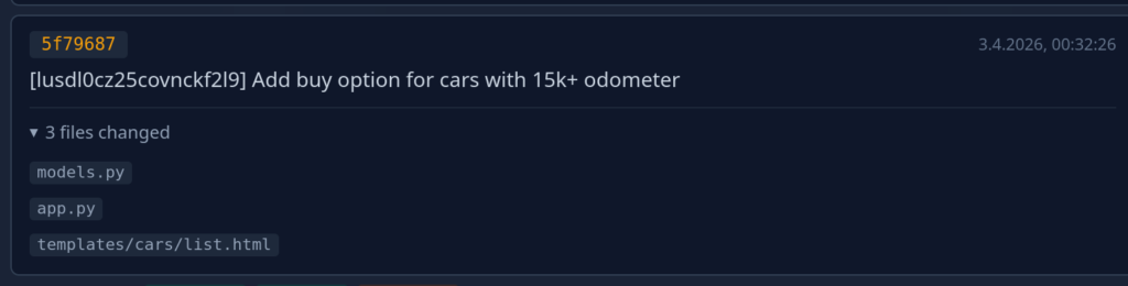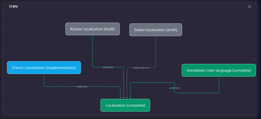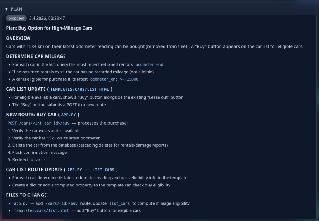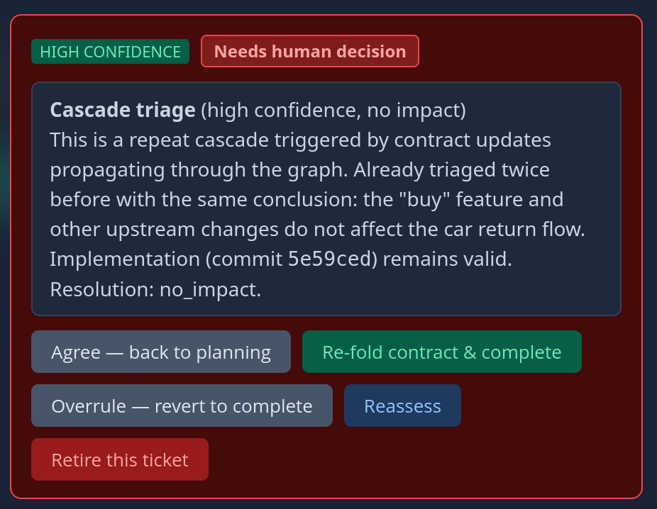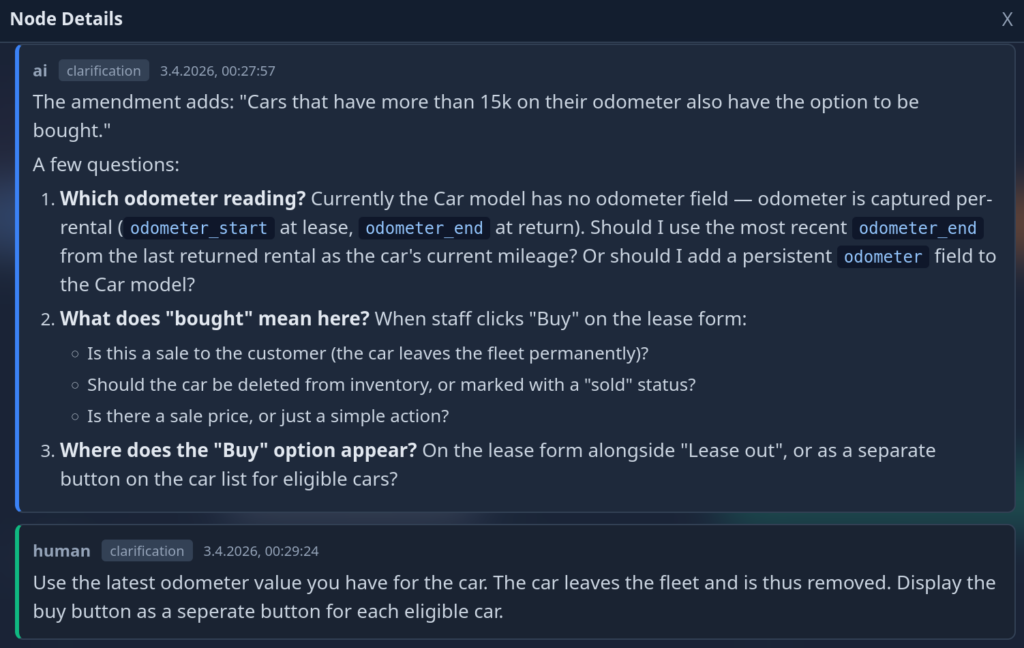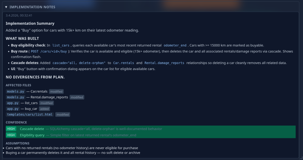 Again: Once the user is happy with the implementation they accept it and the ticket changes state to “implemented”. Now, the neat thing is that all this data stays available and an agent that works to extend this feature or works on related features is able to access it during planing. Even more interesting: If we change the specification of this feature later on, the AI can gauge the impact of the change across the project: